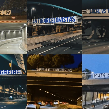 Ομάδα οπαδών της Εσπανιόλ, «La Curva» μοιράστηκε στα κοινωνικά δίκτυα ένα σύνολο φωτογραφιών που καταγράφουν διάφορα πανό τοποθετημένα σε διαφορετικές τοποθεσίες στην πόλη της Βαρκελώνης με μηνύματα που απευθύνονται στον μεγαλύτερο αντίπαλό τους.