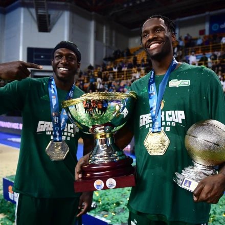 Ο Κέντρικ Ναν και ο Νάιτζελ Χέιζ-Ντέιβις με το βραβείο του MVP και το Κύπελλο Ελλάδας / πηγή: eurokinissi