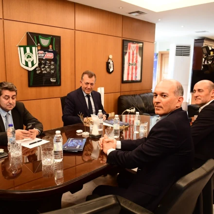Μετά το τέλος της συνάντησης του Δημήτρη Γιαννακόπουλου με τον Γιάννη Βρούτση έφτασαν στο γραφείο του αναπληρωτή Υπουργό αθλητισμού, οι Παναγιώτης και Γιώργος Αγγελόπουλος. Το ραντεβού του ισχυρού άνδρα του Παναθηναϊκού με τον Γιάννη Βρούτση κράτησε πάνω από μία ώρα. Από την πλευρά της ομάδας του Πειραιά έφτασαν πρώτα η Τζένη Γραβιά, ο Χρήστος Μπαφές και ο Νίκος Λεπενιώτης.