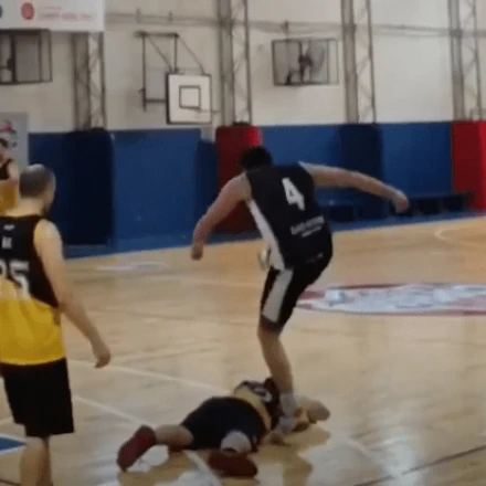 Μετά από ένα τζαρτζάρισμα μεταξύ τους, ο παίκτης με την μαύρη φανέλα, έριξε αγκωνιά σε αυτόν με την κίτρινη και τον ξάπλωσε στον αγωνιστικό χώρο. Ο δεύτερος, πριν καν καταλάβει τι του έχει συμβεί δέχτηκε εκ νέου χτύπημα, στο κεφάλι! Ο επιτιθέμενος τον πάτησε με μανία και τον ανάγκασε να χτυπήσει στο παρκέ, αλλά ευτυχώς δεν του προκάλεσε σοβαρό τραύμα και το θύμα σηκώθηκε από το έδαφος άμεσα.
