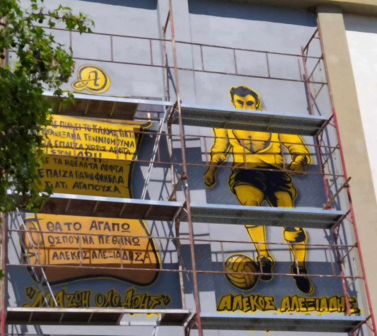 Οι δημιουργοί του έργου πήραν έμπνευση από τη θρυλική φωτό του Αλεξιάδη με τη σκισμένη φανέλα που είχε και ο ίδιος κρεμασμένη τον τοίχο του σπιτιού του ενώ δίπλα ακριβώς υπάρχουν αποσπάσματα από συνέντευξη που είχε δώσει μιλώντας για τον Άρη και έχουν μείνει στην ιστορία. Το έργο έχει σχεδόν ολοκληρωθεί και λογικά θα είναι έτοιμο στον πρώτο εντός έδρας αγώνα με τον ΟΦΗ για τα playoffs.