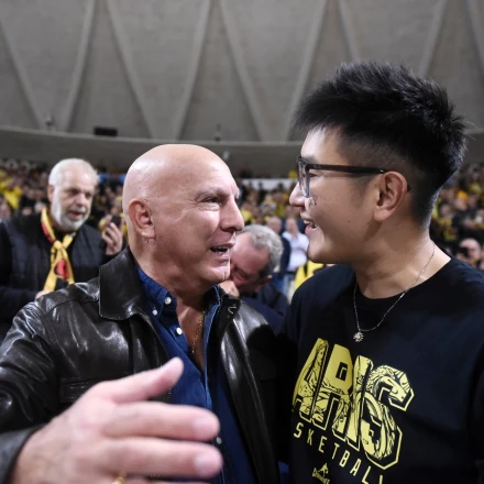 Οι δύο τους αντάλλαξαν μία χειραψία και ο θρύλος του ελληνικού μπάσκετ καλωσόρισε τον νέο ιδιοκτήτη του «Θεού του Πολέμου» στη Θεσσαλονίκη, πριν αυτός γίνει... ένα με τους «κιτρινόμαυρους» οπαδούς.