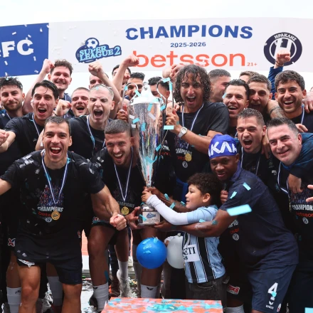 Η στιγμή που ο Κριστιάν Κούστα με όλο το ποδοσφαιρικό τμήμα του Ηρακλή σήκωσαν την κούπα του πρωταθλητή στον ουρανό της Θεσσαλονίκης.