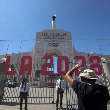Μια πινακίδα του «LA2028» στην πρόσοψη του Memorial Coliseum στο Λος Άντζελες / Πηγή: Imago