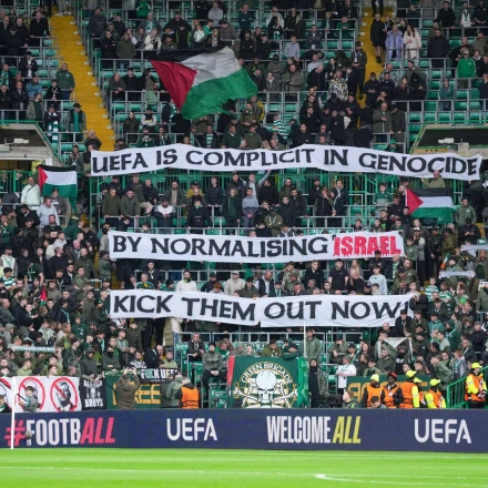 Στις κερκίδες όπου βρίσκεται η «Πράσινη Ταξιαρχία», οι οργανωμένοι οπαδοί της σκωτσέζικης ομάδας, σήκωσαν ένα πανό κατηγορώντας την αρμόδια αρχή του ευρωπαϊκού ποδοσφαίρου ότι είναι «συνένοχη σε γενοκτονία» επιτρέποντας σε ισραηλινές ομάδες να συμμετέχουν σε διεθνείς διοργανώσεις