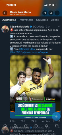 Μια αρνητική διάσταση στο θέμα της προσπάθειας που έχει ήδη ξεκινήσει ο Άρης με τη Ρέιντζερς προκειμένου να αποκτήσει τα δικαιώματα του Χοσέ Σιφουέντες, δίνει ο δημοσιογράφος, Σέζαρ Λουίς Μέρλο, που ειδικεύεται σε θέματα που έχουν να κάνουν με παίκτες απο το Εκουαδόρ και ήταν αυτός που είχε αποκαλύψει τον ερχομό του 25χρονου μέσου στον Αρη. Σύμφωνα με ανάρτησή του πριν από λίγη ώρα κάνει λόγο για επιστροφή του παίκτη στη Ρέιντζερς. «Ο Σιφουέντες δεν θα συνεχίσει στον Αρη την επόμενη σεζόν. Παρά την καλή του απόδοση, τα μέρη συμφώνησαν ότι δεν θα ασκηθεί το δικαίωμα αγοράς. Ο μέσος θα επιστρέψει στη Ρέιντζερς και τα επόμενα βήματα θα συζητηθούν αργότερα», αναφέρει χαρακτηριστικά.