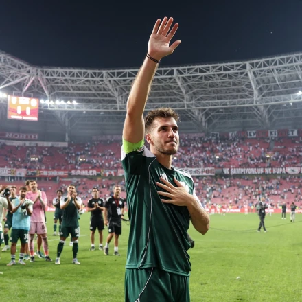 Ο Έλληνας σέντερ φορ, εμφανώς συγκινημένος, σήκωσε το χέρι του και ευχαρίστησε τους φιλάθλους των πρασίνων για όλες τις στιγμές που πέρασε ως παίκτης του Παναθηναϊκού, στο φωτογραφικό «κλικ» της βραδιάς.